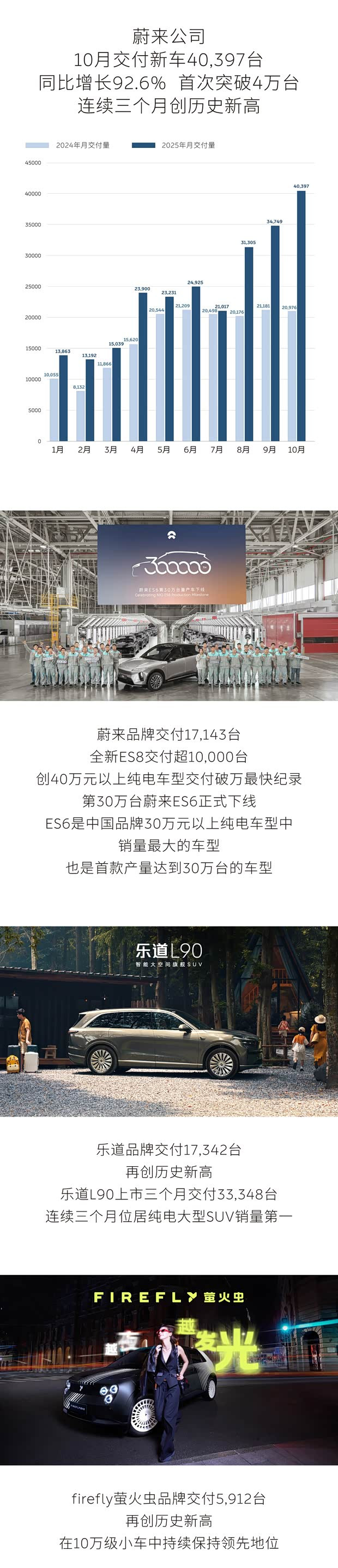 [汽车之家资讯]11月1日,我们从官方获悉,蔚来公司10月新车交付首次超过4万台。具体来看,2025年10月,蔚来公司交付新车40,397台,同比增长92.6%。